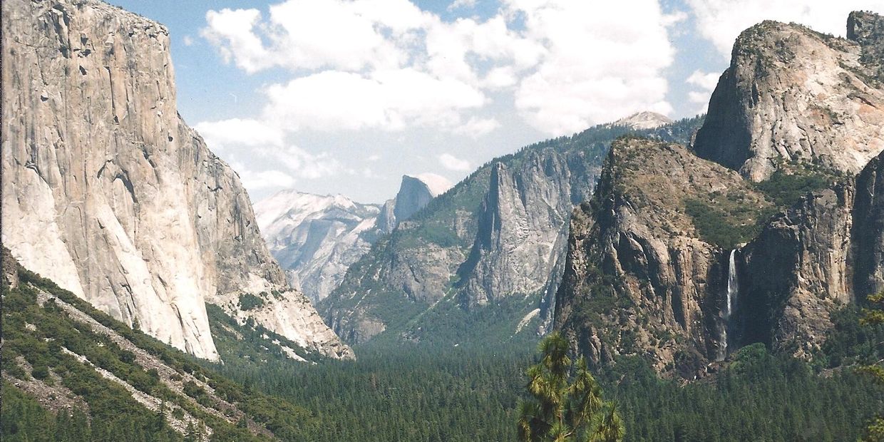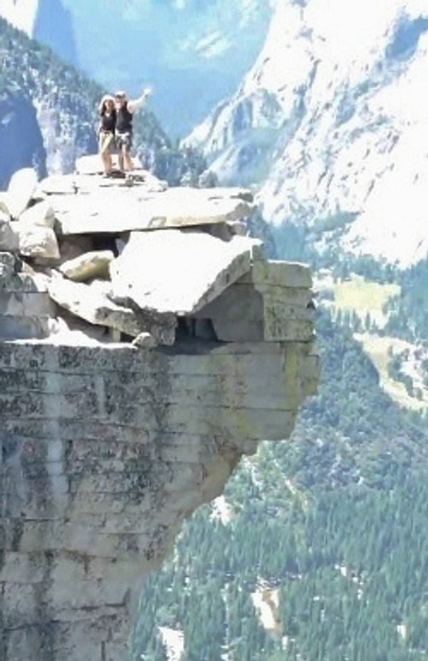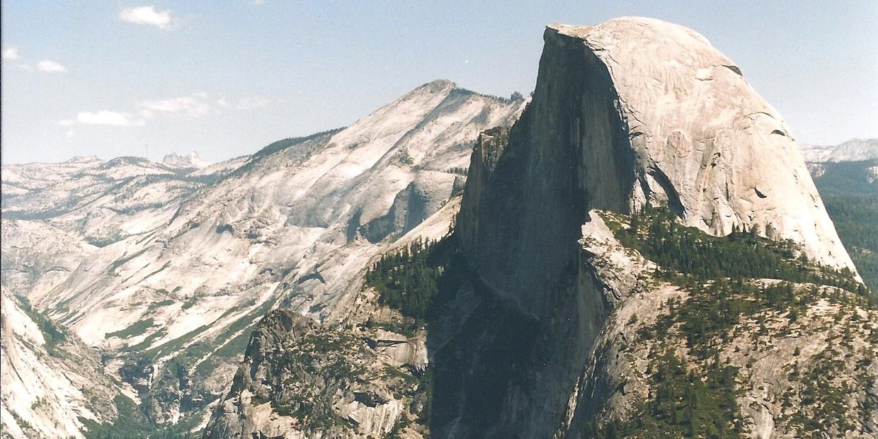 We're on a short hike in Yosemite after just arriving. JB points to the sheer face of Half Dome. He sees at least two techincal climbers scaling the cliff face .