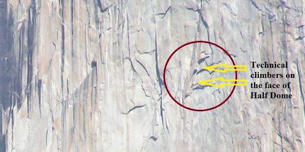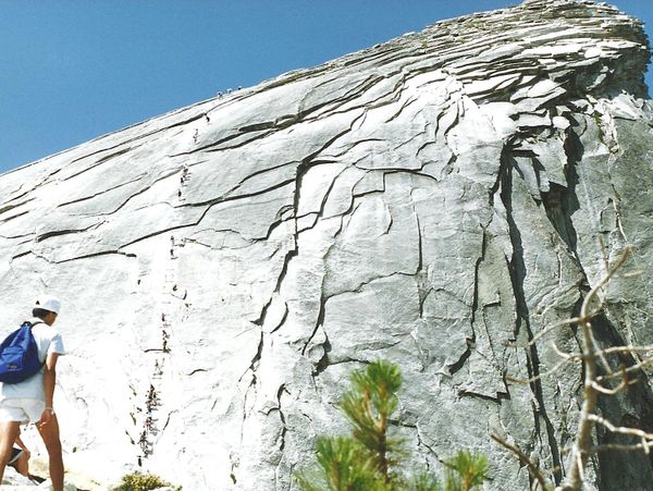 The sheer face of Half Dome. Two climbers are taking a short cut to the top.