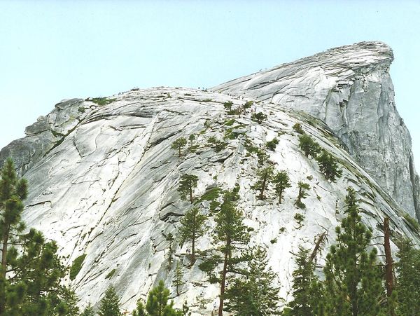 We've reached the clearing with a view of the last 900 feet to the summit. The lower curved section is the sub dome. Half Dome rises above it. Climbers can be seen working their way up the cables.
