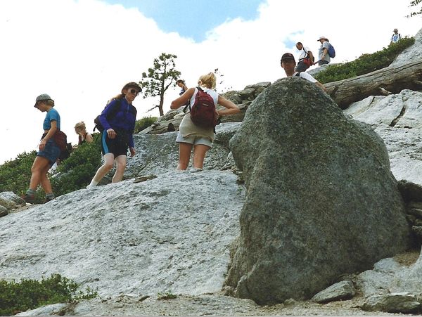 Phyllis (2nd from left) moves along the switchbacks of the sub dome--making the 500 foot climb to reach the cable run to the summit.
