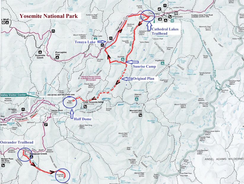After much discussion with experienced hikers at work, the plan was to enter the wilderness boundary at the 8,200 ft Cathedral Lakes Trailhead off Cal Rt 120, northeast of the Yosemite Valley. From there we’d follow the John Muir Trail southwest over hill and dale, mountain and valley, down to the iconic 8,800 ft granite Half Dome monolith. We’d climb Half Dome and afterwards spend the night outside the wilderness at a nearby campground. On day 7 we’d hike into the Yosemite Valley and complete our adventure with a shuttle bus ride back to our original trailhead. A 4-hour car ride and we’d be back to my home in the San Francisco Bay Area.