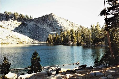 And so, that morning of the third day we broke camp and set out for the Sunrise Lakes. Although you’d think the 4-mile distance was but a hop, skip, and a jump—particularly for a pair of runners—Joanne’s ankle pain, the altitude, the rugged up and down terrain, and the weight of our equipment all contributed to a slow, measured pace. We paused a few times for rest breaks and to enjoy the beauty of the environment we passed through. On one occasion we set down the packs and relaxed for several minutes on a sun-warmed boulder. Lunch was in order, so we munched on peanut butter crackers as we took-in the scenery around us: the gray, sloping, rocky ground, the craggy mountain peaks and high buttes. Here and there clumps of mountain pines occupied the lower levels.