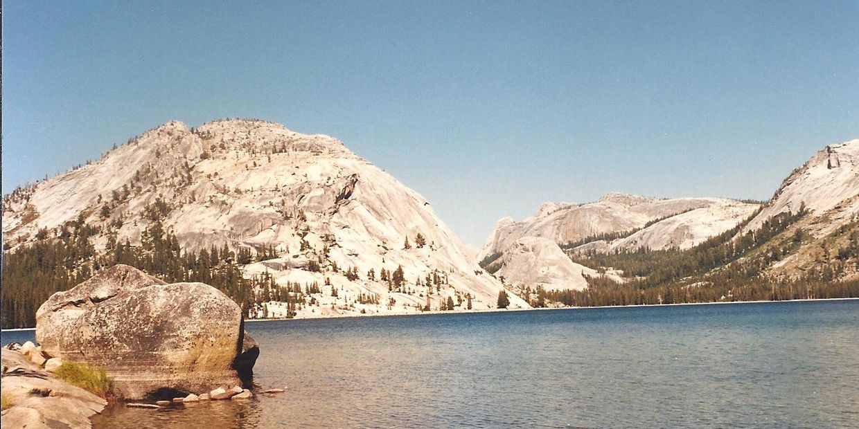 We reached the beautiful blue Tenaya Lake by mid-afternoon and set up our tent. Although there were no other occupants there, this was a well-used, formal walk-in campground on the south side of the lake. The lake water was clean and not as cold as I expected. With the sun still high overhead, I decided to strip down to my running shorts and take a dip. I got in as far as my waist, splashed around a bit, and that was enough for me. It was refreshing, nonetheless.