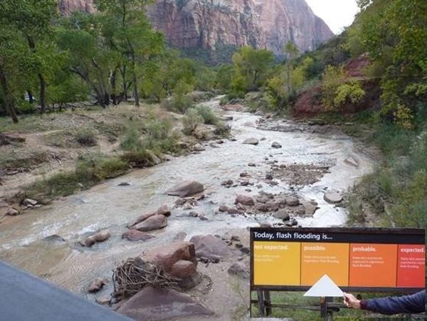 JB on the Virgin River near the entrance to the Narrows. There was no hiking the waters of the Narrows on this day for JB and Jane. Threat of flash floods, 12-foot walls of water and death meant we would hike elsewhere.