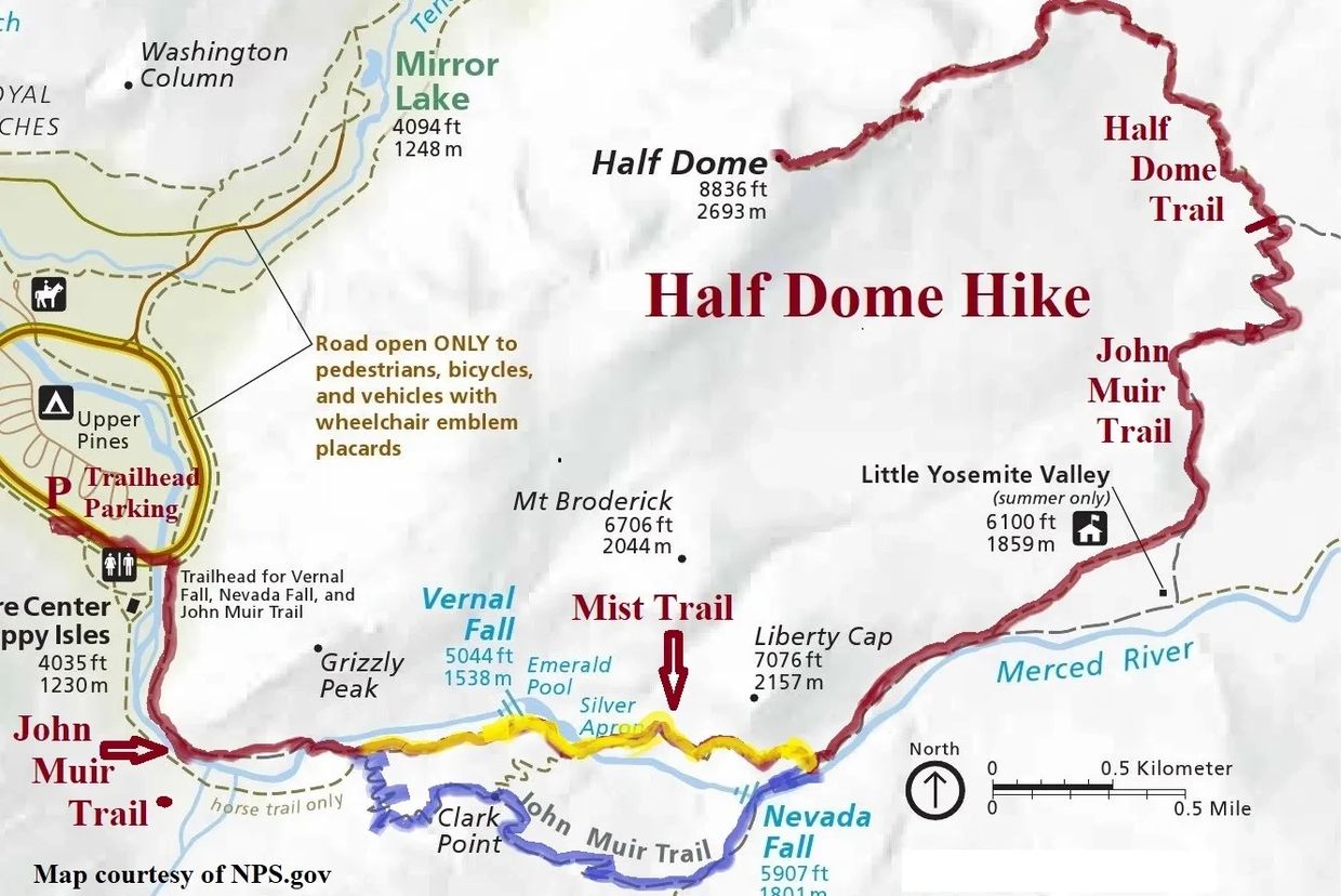 The 17-mile r/t hike. Include the yellow Mist Trail on the way up and the blue John Muir Trail on the way down.
